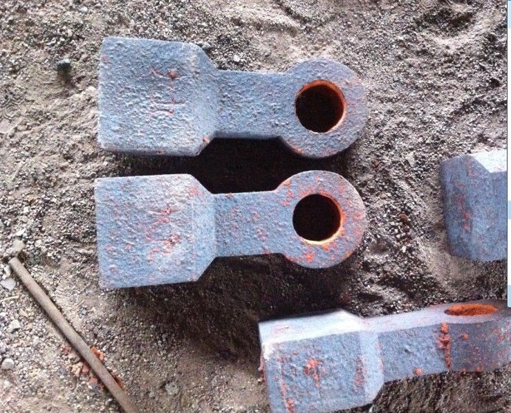 锤头是锤式破碎机核心零部件之一,排列在破碎机转子的锤轴上,锤头在破碎机高速运转时直接打击物料,最终破碎成合适的物料粒度。  破碎机锤头 市场上的破碎机锤头根据制造工艺可以分为两种:铸造和锻造,但是他们的耐磨程度是不一样的。由于破碎物料,头部需要良好的耐磨性而柄部又需要足够韧性,通常用合金钢、高锰钢、铸钢加高铬铸铁双金属复合等材料用锻造或铸造方法一次成型,配上相应的热处理工艺就比较经济一点,破碎机锤头根据材质可以分为种:高锰钢锤头、双金属锤头、复合锤头、大金牙锤头、中铬合金锤头,硬质合金锤头等.主要因素是二氧化硅的含量,现代工业下的技术表明:采用硬质合金锤头在耐磨性上表现良好。